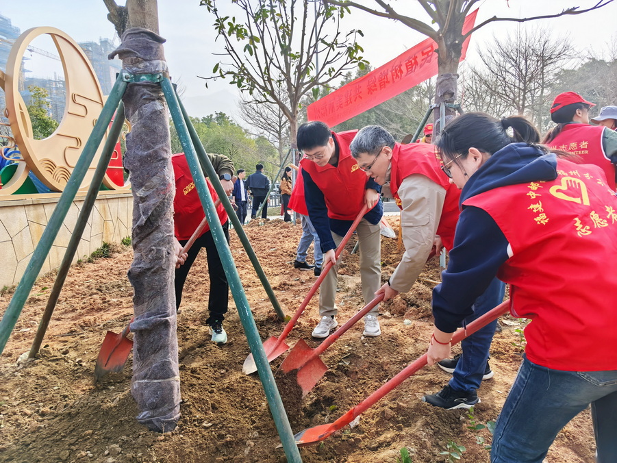 福州分公司党支部组织党员、青年代表参加福建省绿化委员会指定植树点——福州市光明港公园“全民植树增绿 共建美丽福州”活动,并开展“践行雷锋精神 守护盎然绿意”植树节主题党日活动。大家认真学习了解福州市市花——茉莉花的文化寓意及种植要点,然后合力种下一株株茉莉花和乔木,表示要将绿色理念融入日常工作和生活,为打造人与自然和谐共生的美丽家园作出更大贡献。